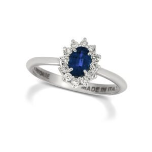 Anello Armonie gioielli modello Kate in oro bianco lucido con zaffiro blù ovale ct. 0,54 contornato da una fila di diamanti taglio brillante con montatura a griffe ct 0,21 F/Vs. Misura 14 modificabile. Dimensioni testa anello 10,5 x 8,4 mm. Scatola e Certificato di Garanzia Armonie gioielli originale.