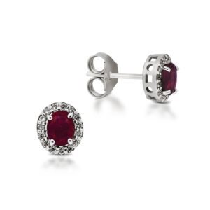 Orecchini a perno Armonie gioielli modello Kate in oro bianco lucido con rubino ovale ct. 1,00 (totale 2 pietre) contornato da 15 diamanti taglio brillante con montatura a griffe ct. 0,16 Vs/F (totale 30 pietre). Dimensioni orecchino 7,4 x 6,3 mm. Scatola e Certificato di Garanzia Armonie gioielli originali.