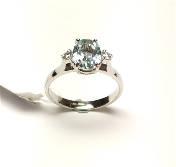 Anello Artigianale in oro bianco lucido con acquamarina taglio ovale ct. 0,96 ( dimensioni pietra 6 x 8 mm.) con montatura a griffe e due diamanti laterali ct 0,06. Misura 14 modificabile. Dimensioni testa anello: 8,2 x 11,5 mm. Garanzia e scatola del negozio.