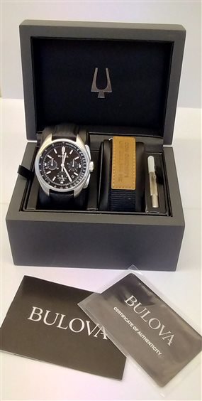 Bulova ha fatto la storia dello spazio il 2 agosto 1971, durante la missione Apollo 15, il cronografo Lunar Pilot (Moon) personalizzato per le condizioni lunari dagli ingegneri Bulova è stato indossato sulla luna. Bulova, oggi, fa nuovamente storia con l'edizione speciale Lunar Pilot Chronograph, il modello replica dell'originale aggiornato grazie all'esclusivo movimento brevetto Bulova quarzo ad alte prestazioni con una frequenza di 262 kHz per una precisione senza precedenti. Cassa in acciaio 316L opaco , corona e pulsanti lucidi fondo avvitato con dedica evento. Movimento al quarzo Cronografo 262 kHz Precisionist ( Crono 1/20 sec. fino a 60 min.). Quadrante nero opaco con scala tachimetrica, indici e lancette bianchi e luminescenti. Vetro zaffiro antiriflesso. Cinturino in pelle nera testurizzata fibbia con ardiglione. Impermeabile 5 bar (5 atm). Scatola con 2 alloggiamenti, per l'orologio ed il cinturino di ricambio in nylon nero che richiama l'originale. Certificato di Autenticità Libretto che commemora la data della missione (DOM) 02 08 1971 Libretto Istruzioni e Garanzia 5 anni Originali.