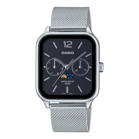 Orologio Unisex solo tempo con complicazioni. Cassa rettangolare in metallo lucido 34 x 38/44 mm. Movimento al quarzo ore minuti secondi. Quadrante nero con contatore giorno e data e fasi lunari. Vetro minerale. Bracciale in acciaio regolabile maglia Milano. Impermeabile 5 bar ( atm.). Scatola istruzioni e garanzia originali