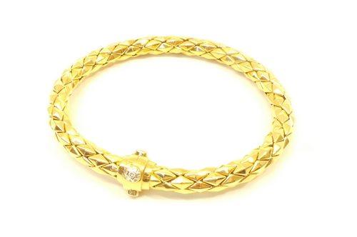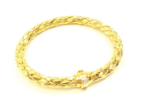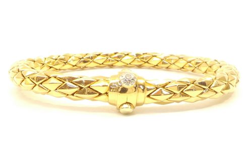 Bracciale Chimento in oro rosa lucido a maglia tubolare brevettata Stretch ( diametro 6 mm. ) con una particolare lavorazione interna che permette una flessibilità e un estensione notevole ( da 19,5 a 21,5 cm.). Chiusura brevettata a due pulsanti con logo impreziosita con piccolo diamante. Certificato di garanzia e scatola del negozio. (non originali)