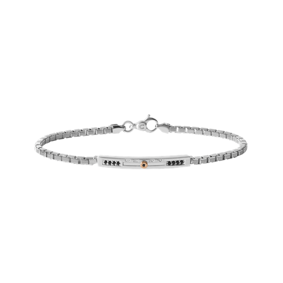 Bracciale uomo COMETE collezione Passioni in argento 925% rodiato con maglia a catena squadrata. Targa centrale in argento 925% con spinelli neri incastonati ai lati , al centro simboli cambio automatico con pomoletto Rose Gold e spinello nero. La chiusura del bracciale è a moschettone. I bracciali che si ispirano al mondo dei motori hanno come elementi caratterizzanti il cambio. Lunghezza cm 21.