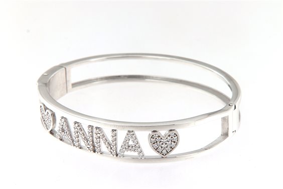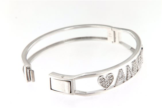 Bracciale a schiava rigido con chiusura a cassetta in argento 925‰ rodiato con lettere e simboli in pavè di zirconi incastonati a mano. Misura Medium 50 X 60 mm.