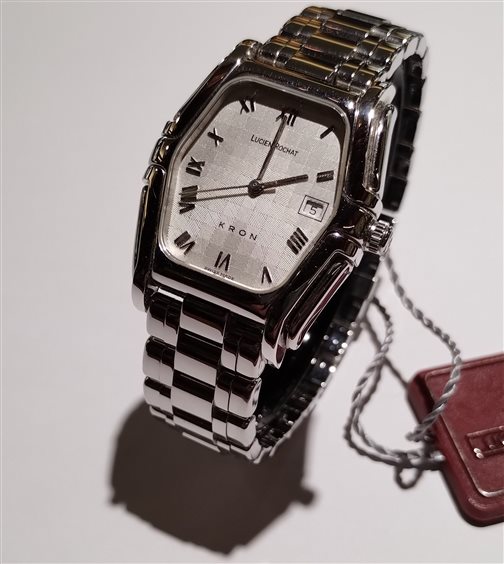 Orologio donna Lucien Rochat modello Kron Dame automatico Solo Tempo. Originale cassa esagonale 38 x 3 mm. in acciaio lucido inox 18/10, 160 vickers con anse porta bracciale smontabili in argento 800 con trattamento palladio, fondo serrato con 10 viti. Movimento Lucien Rochat cal.1213 meccanico automatico ore minuti secondi e data, 20 rubini, bilancere 28.800 oscillazioni, altezza movimento 8,7 mm. Vetro zaffiro antiriflesso. Quadrante argentato sfaccettato con cifre arabe e lancette lucide. Bracciale regolabile in acciaio lucido chiusura a scomparsa deployante con pulsanti. Impermeabile 5 atmosfere. Peso 84 grammi. Scatola e libretto istruzioni con garanzia 2 anni originali.