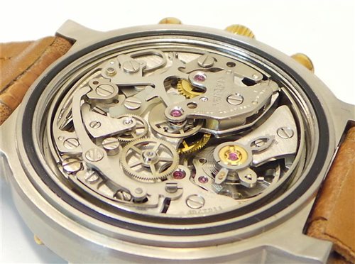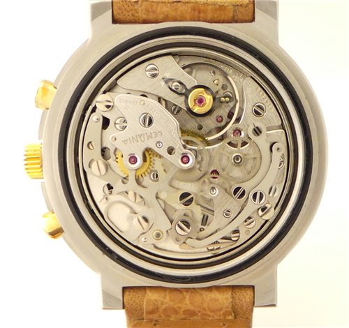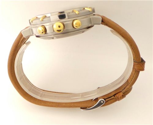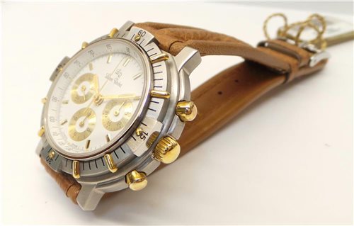 Orologio cronografo meccanico modello Royal Air. Cassa acciaio spazzolato diametro 37,5 mm. e 12,8 mm. di spessore lunetta girevole unidirezionale con elementi in oro giallo fondo a vite ansa cinturino 18 mm. Movimento cronografo meccanico manuale calibro Lemania 1873 .Il calibro Lemania 1873, debutta nel 1968. Si tratta di un calibro manuale con 3 contatori: secondi continui a ore 9, minuti crono a ore 3, ore crono a ore 6, secondi crono al centro. Il calibro misura 12 linee (27 mm. di diametro) per 6,87 di spessore , a seconda dei modelli si può trovare con 17 o 18 rubini. Il bilanciere oscilla a 21.600 a/h per una riserva di carica di 40 ore .Vetro zaffiro . Quadrante bianco indici applicati e lancette dorate. Cinturino in coccodrillo opaco fibbia con logo . Impermeabile 10 atm. Peso 72 grammi. Scatola (cofanetto)Libretto Istruzioni e Garanzia 2 anni originali.