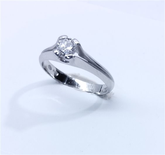 Anello in platino lucido con la parte superiore del gambo che si divide sul castone in due griffe per parte incastonando un diamante di ct.0,44. Misura 15. Certificato internazionale di Garanzia e Autenticità.