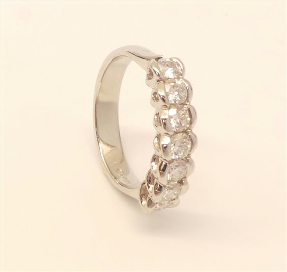 Anello in Platino lucido modello riviera con 7 diamanti per totale ct. 0,90 incastonati singolarmente su originale montatura. Misura 17 modificabile. Certificato internazionale di Garanzia e Autenticità.