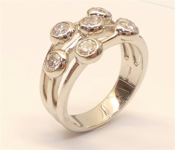 Anello donna Monile in Platino 950 mill. con 7 diamanti per un totale di ct. 0,82 incastonati separatamente. Misura 15. Peso 12,4 grammi. Certificato internazionale di Garanzia e Autenticità.
