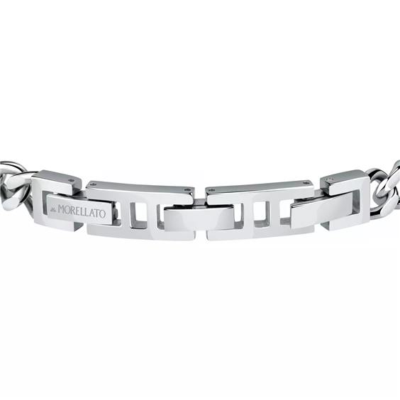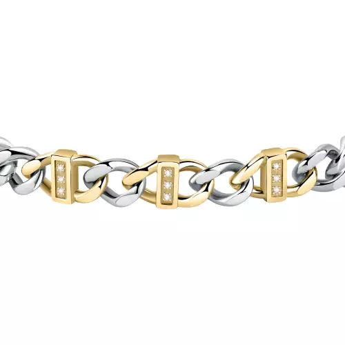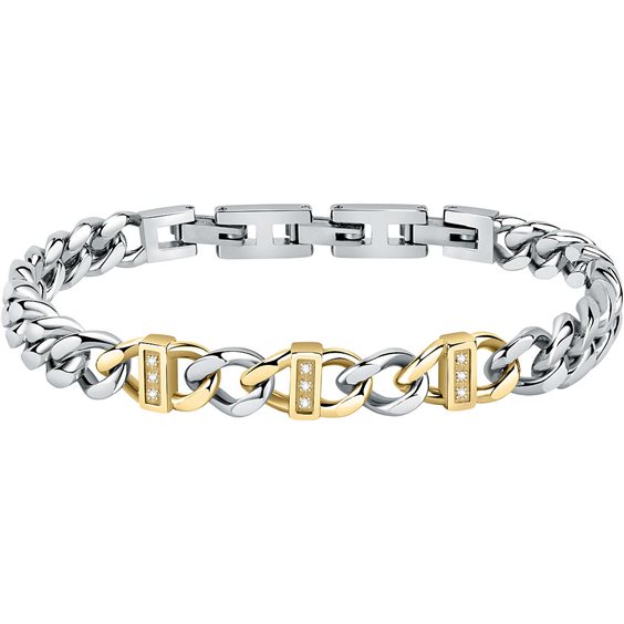 Bracciale uomo Morellato della collezione Diamonds. Bracciale maglia groumette in acciaio lucido con tre elementi centrali placcati oro giallo con diamantini. Misura bracciale 22cm. accorciabile a 18.5cm. Chiusura a scatto. Certificato di Autenticità e Scatola Originale Morellato.