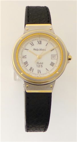 Orologio solo tempo. Cassa in acciaio-oro lucida e opaca, Ø27,6 mm. , spessore 5,9 mm. Movimento svizzero al quarzo, ore, minuti, secondi, data. Vetro minerale. Quadrante bianco smalto, cifre romane nere. Cinturino pelle nera opaca con chiusura personalizzata. Impermeabile. Peso 28,9 grammi. Scatola e garanzia 2 anni Originale.