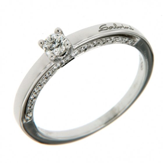 Anello Salvini modello solitario in oro bianco 750% con diamante centrale taglio brillante e lateralmente fedina di diamanti su entrambi i lati per totale di ct. 0,34 G. Peso 3,8 grammi. Misura 15 modificabile. Garanzia e Certificato di Autenticità Salvini con scatola originale.