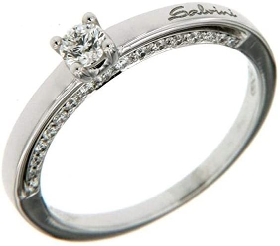 Anello Salvini modello solitario in oro bianco 750% con diamante centrale taglio brillante e lateralmente fedina di diamanti su entrambi i lati per totale di ct. 0,49 G. Peso 3,8 grammi. Misura 15 modificabile. Garanzia e Certificato di Autenticità Salvini con assicurazione rapina e scippo e scatola originale.