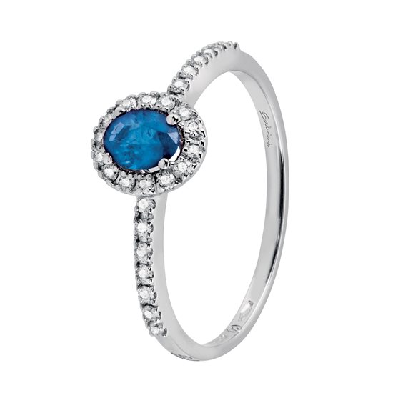 Anello della collezione Dora in oro bianco con zaffiro taglio ovale di caratura 0.50 e diamanti a taglio rotondo di caratura 0.18 di colore GH.