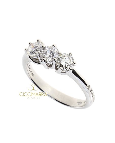 Anello Salvini modello trilogy in oro bianco 18 Kt. con tre diamanti naturali taglio brillante per totale caratura di 0,42 ct. SI G. montatura con castoni a 6 griffe. Misura 13 modificabile. Garanzia e Certificato di Autenticità Salvini e scatola originale.