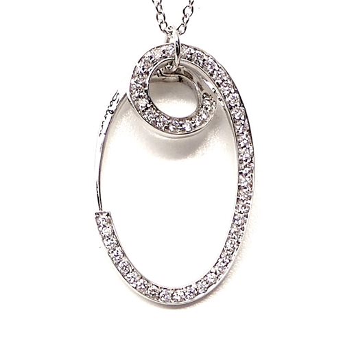 Collana Salvini Collezione Spilla in oro bianco 750% a doppia catena lunghezza 40 cm. allungabile a 45 con ciondolo sfilabile che può essere indossato come spilla, dimensioni del ciondolo 27 mm. x 17 mm. spessore 5,7/1,7 mm. con 45 diamanti taglio brillante ct 0,36 H. Peso complessivo collana 5,8 grammi. Chiusura personalizzata a moschettone con diamantino. Garanzia e Certificato di Autenticità Salvini con scatola originale.