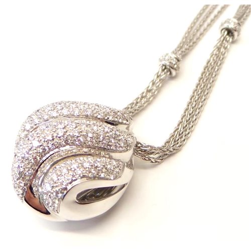 Collana a tripla catena in oro bianco 750% lunghezza 51 cm. chiusura personalizzata con diamante ct 0,02, due distanziatori fissi in oro bianco e diamanti ct 0,13 H in prossimità del pendente centrale scorrevole di forma in oro bianco con pavè di diamanti ct 1,16 H , dimensioni 26 x 22 mm. spessore 15,7 mm. peso complessivo 27,2 grammi. Chiusura a moschettone con diamante. Garanzia e Certificato di Autenticità Salvini con assicurazione rapina e scippo e scatola originale.