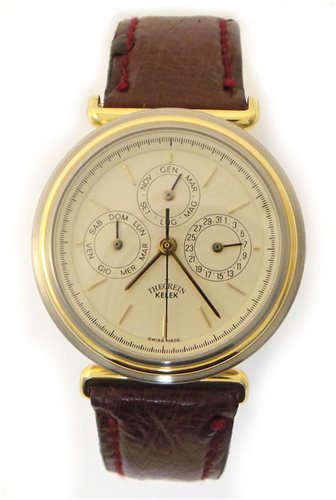 Orologio Multifunzione. Cassa in acciaio inossidabile spazzolato di 36 mm. di diametro e 10 mm. di spessore, lunetta corona e attacchi cassa laminati 20 micron oro giallo 18 kt. ansa cinturino 20 mm. correttori data (3). Fondello con vista movimento. Movimento meccanico automatico ETA 2892-2 con calendario riservato T.K 28.800 A/h, 21 rubini, bilancere Glucydur incabloc. Platina e ponti perlati. Tornitura dei ponti a chiocciola, massa oscillante Cote de Gèneve, lettere incise e dorate, testa delle viti lucidata. Vetro zaffiro. Quadrante colore crema con indici applicati dorati con contatore data a ore 3, contatore giorno a ore 9 , contatore mese a ore 12. Cinturino in pelle di struzzo opaco fibbia con logo. Impermeabile 3 atm. Peso 53 grammi. Scatola (cofanetto) libretto Istruzioni e Garanzia 2 anni originali.