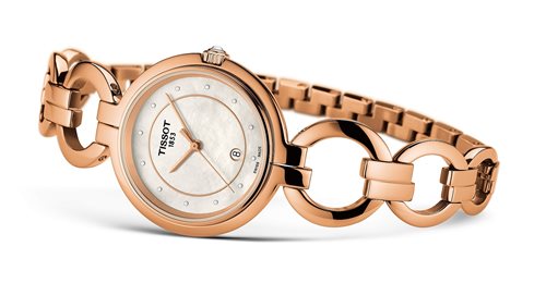 Orologio solo tempo ispirato all eleganza del fenicottero , incarna la semplicita perfetta, attacchi armoniosi e sorprendente sottili con anse spostate. Cassa e bracciale in acciaio 316L lucido con trattamento in PVD oro rosa. Movimento al quarzo Swiss made ETA F03.111 : ore minuti secondi data. Vetro zaffiro antigraffio. Quadrante madreperla con 12 diamanti Top Wesselton (con certificato) lancette lucide. Bracciale regolabile con la nuova chiusura integrata al bracciale consente un'apertura laterale , agevolandole così la vestibilità. Impermeabile 5 bar (atm.). Peso 41 grammi. Garanzia Internazionale 2 anni. Scatola Originale. L'orologio gioiello ideale per essere un componente essenziale del guardaroba di ogni donna. Il Tissot Flamingo può essere descritto in due parole: elegante e audace, propio come il fenicottero.